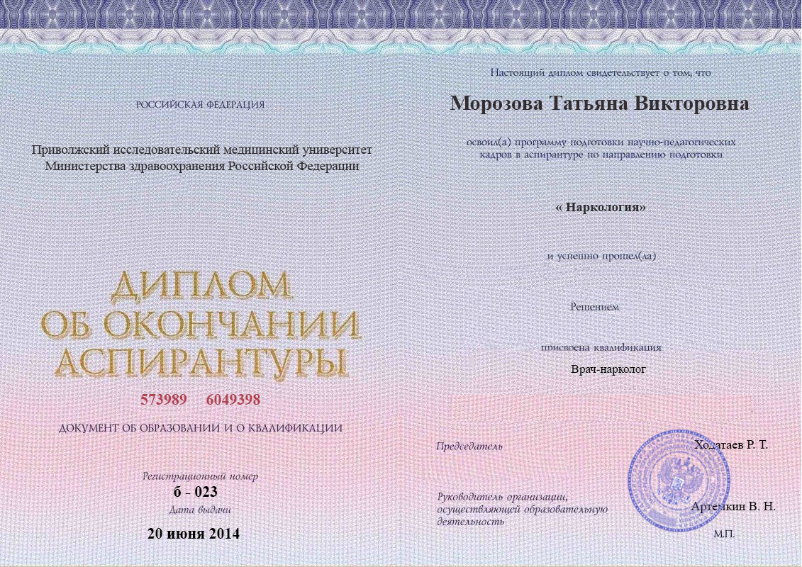 Диплом об окончании аспирантуры Морозовой Татьяны Викторовны